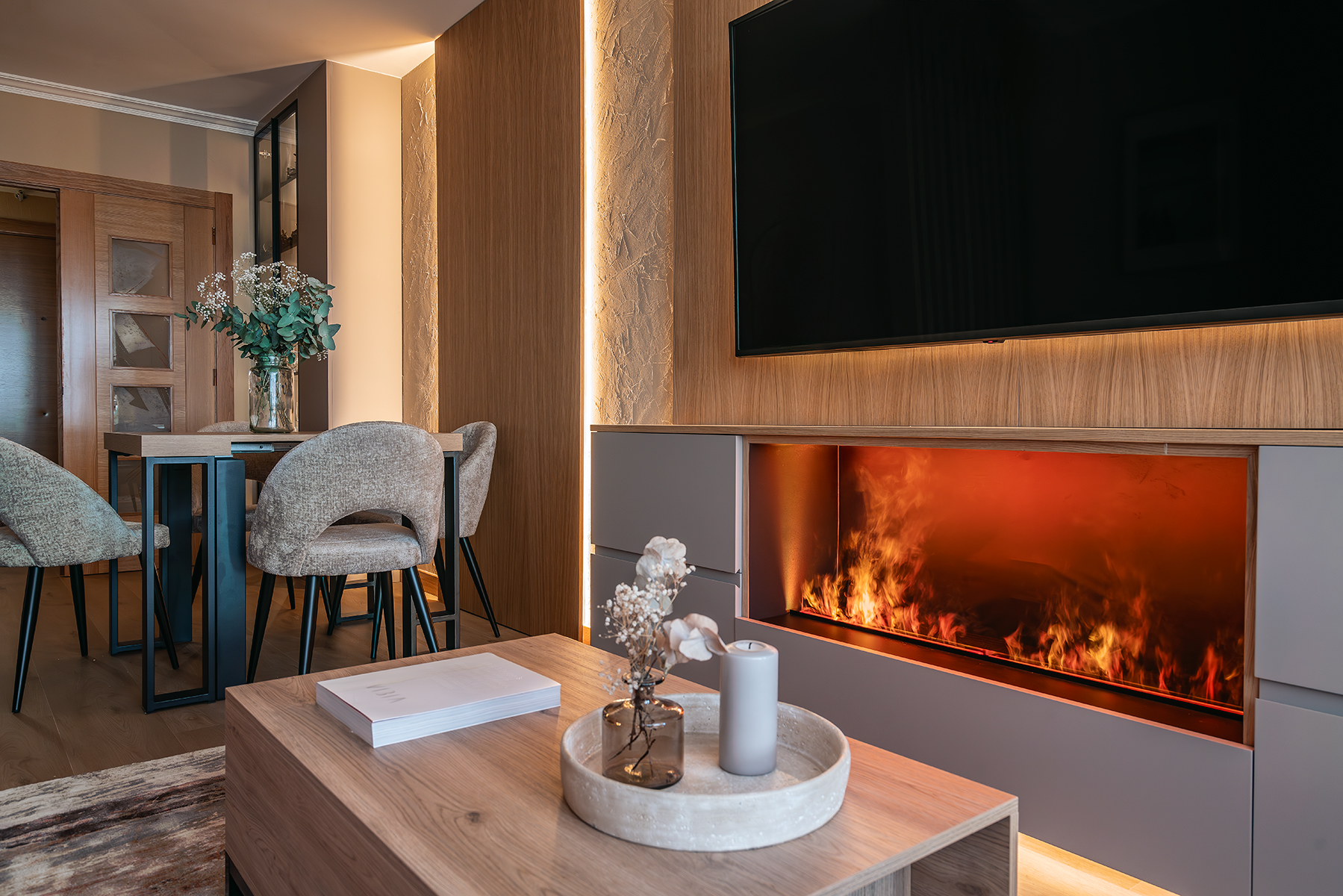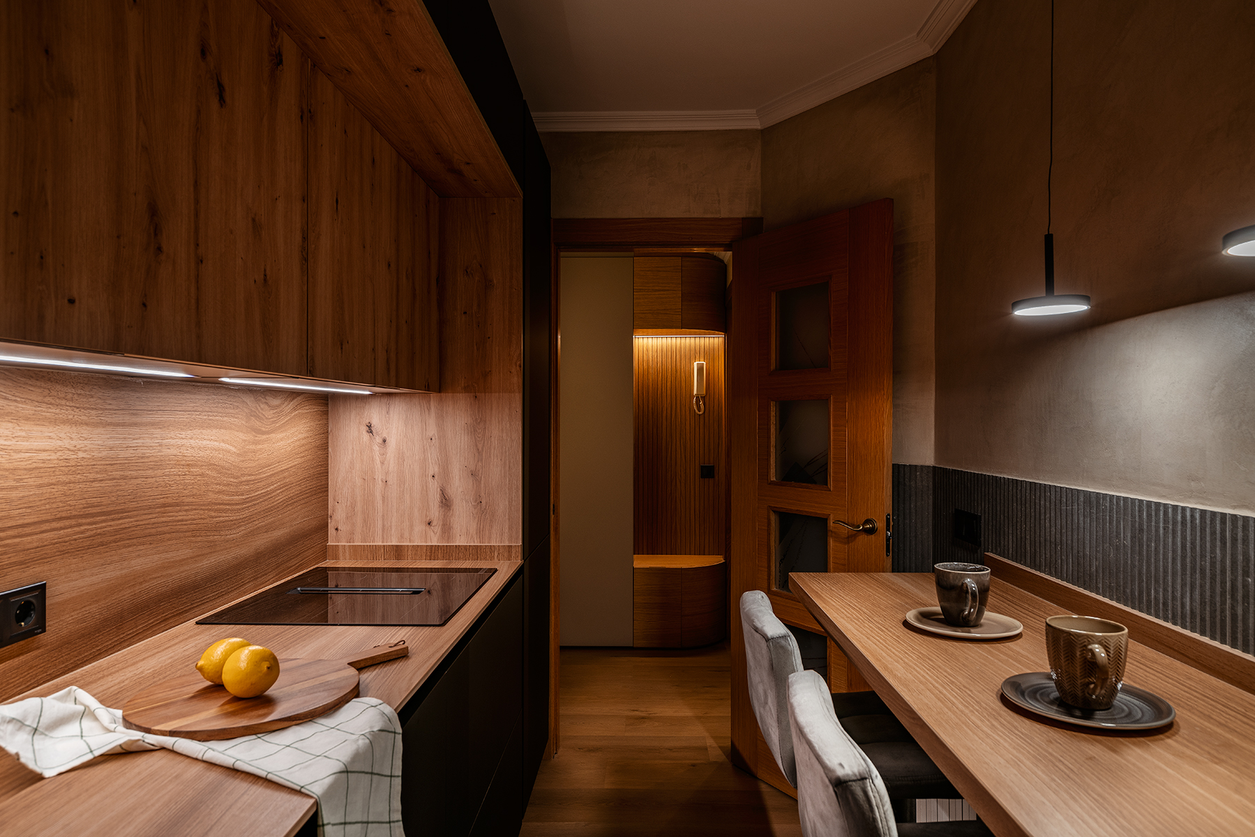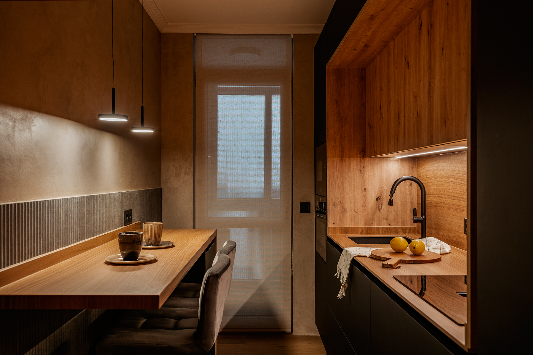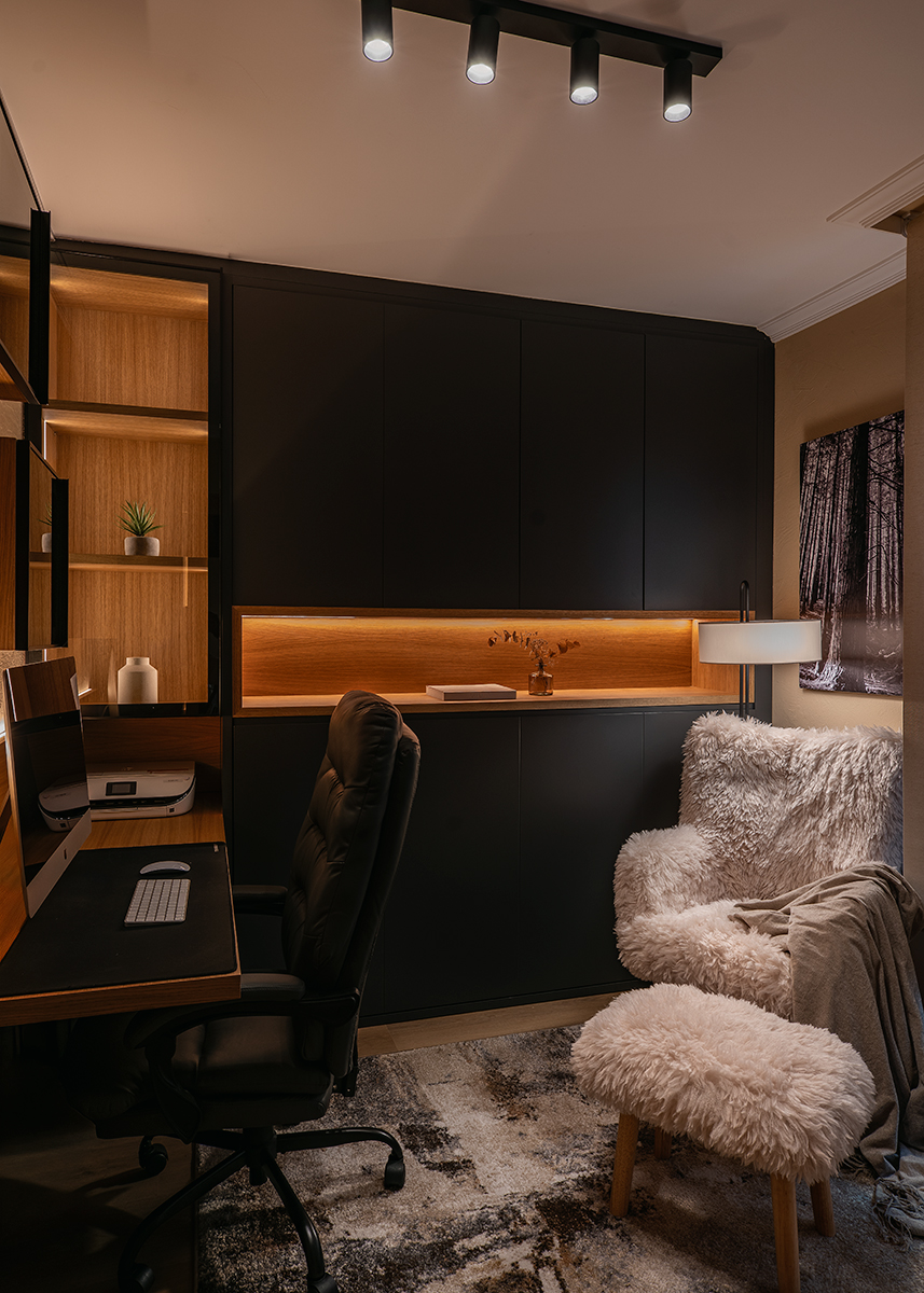 La combinación de los tonos oscuros, la madera y la iluminación hacen que espacio sea confortable.